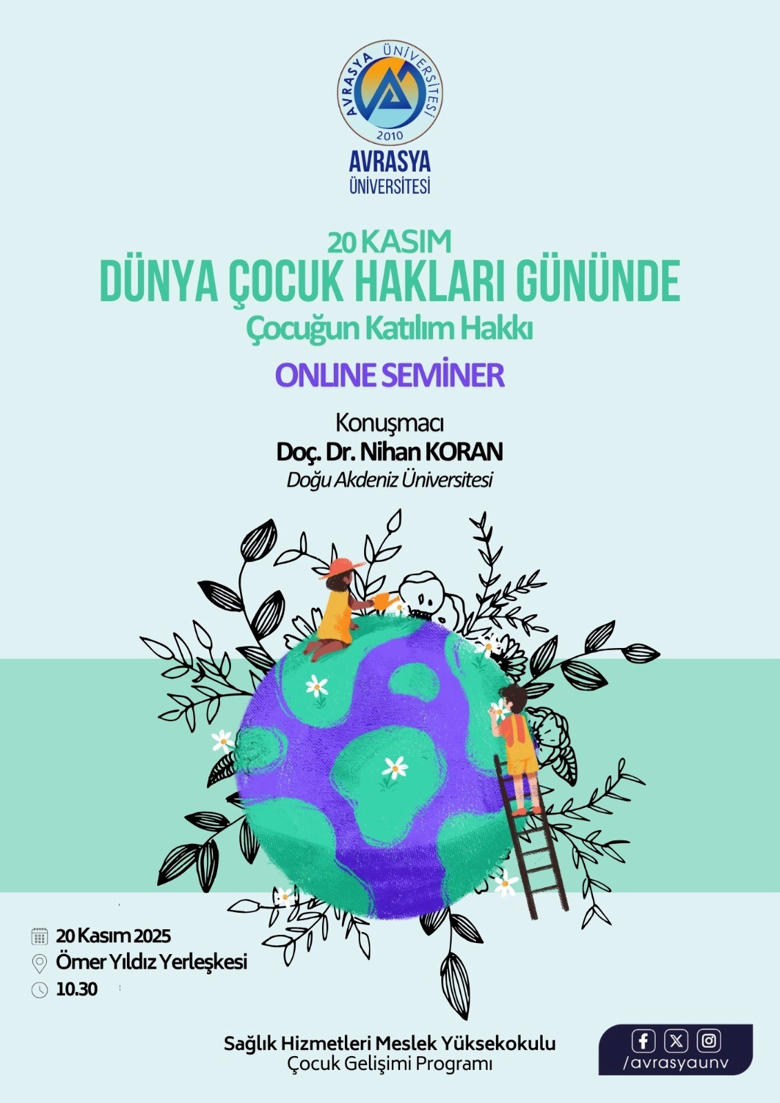 Trabzon, Kasım 2025 – Avrasya Üniversitesi Çocuk Gelişimi Kulübü tarafından düzenlenen ÜNİDES projesi olan “Çocuksuz Kütüphane Kalmasın” etkinliğine Sağlık Hizmetleri Meslek Yüksekokulu Çocuk Gelişimi Programı öğrencileri de destek oldu. Çocuk Gelişimi Kulübü tarafından yürütülen UNIDES Projesi, çocuklara kitap sevgisini kazandırmak ve kütüphaneleri çocuklarla buluşturmak amacıyla başarıyla tamamlandı. Proje kapsamında düzenlenen etkinliklerin ilk günü, Düşünür Koleji’nden […]